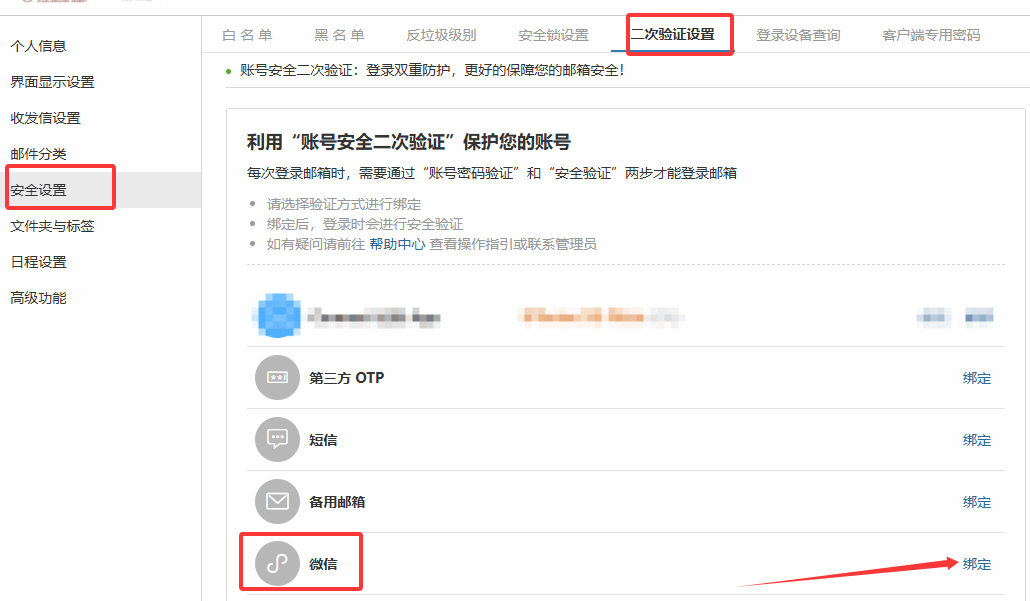 2、在图示部分【安全设置】的【二次认证设置】处,点击【微信】后的【绑定】进行二次认证的绑定